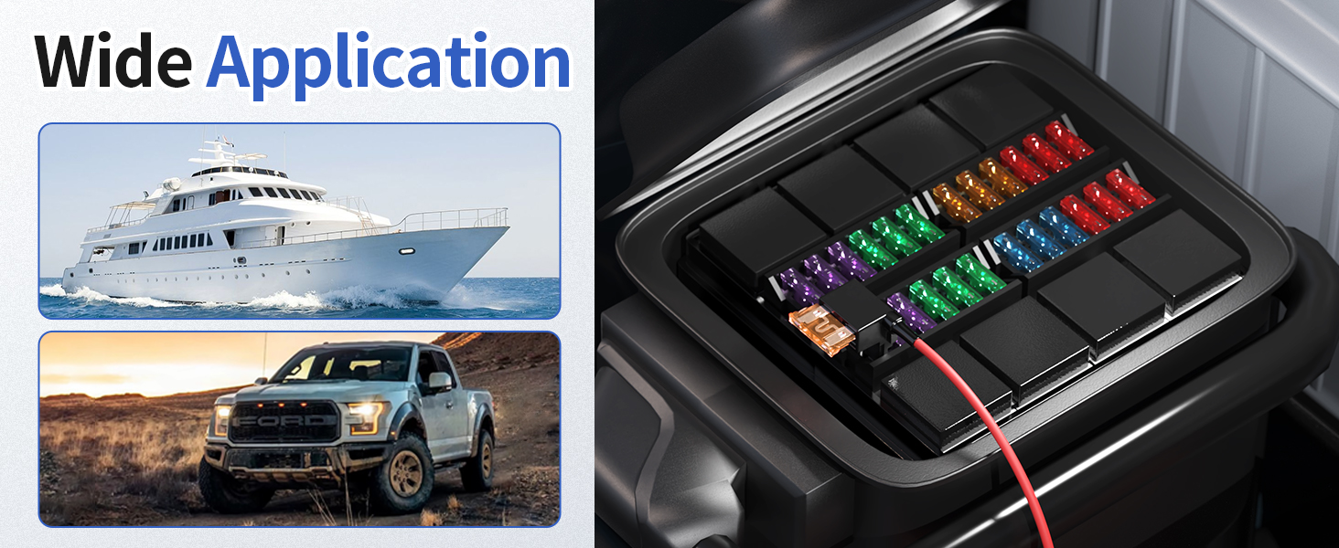 【Wide Application】The auto fuse tap adapter is compatible with automotive, truck, RV, UTV, and boat applications. Moreover, it's suitable for various auxiliary equipment in automobiles, such as tachographs, fuse boxes, car alarms, GPS systems, LED lights, air purifiers, and more.