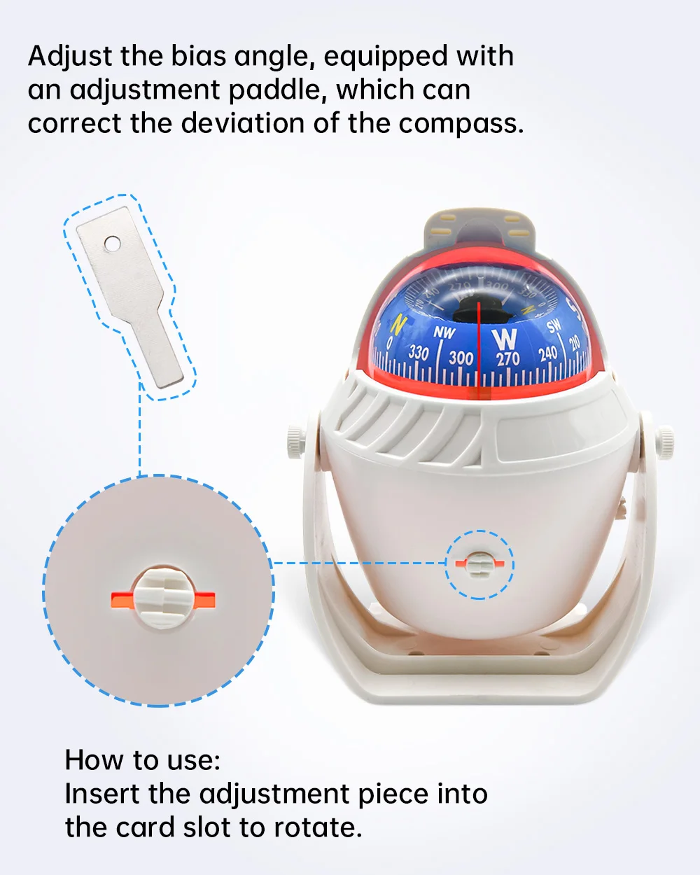 Due to the interference of magnetic objects in the car, the compass will appear deviation, this product has adjustment andcorrection device.The steps are as follows:North-south deviation adjustment